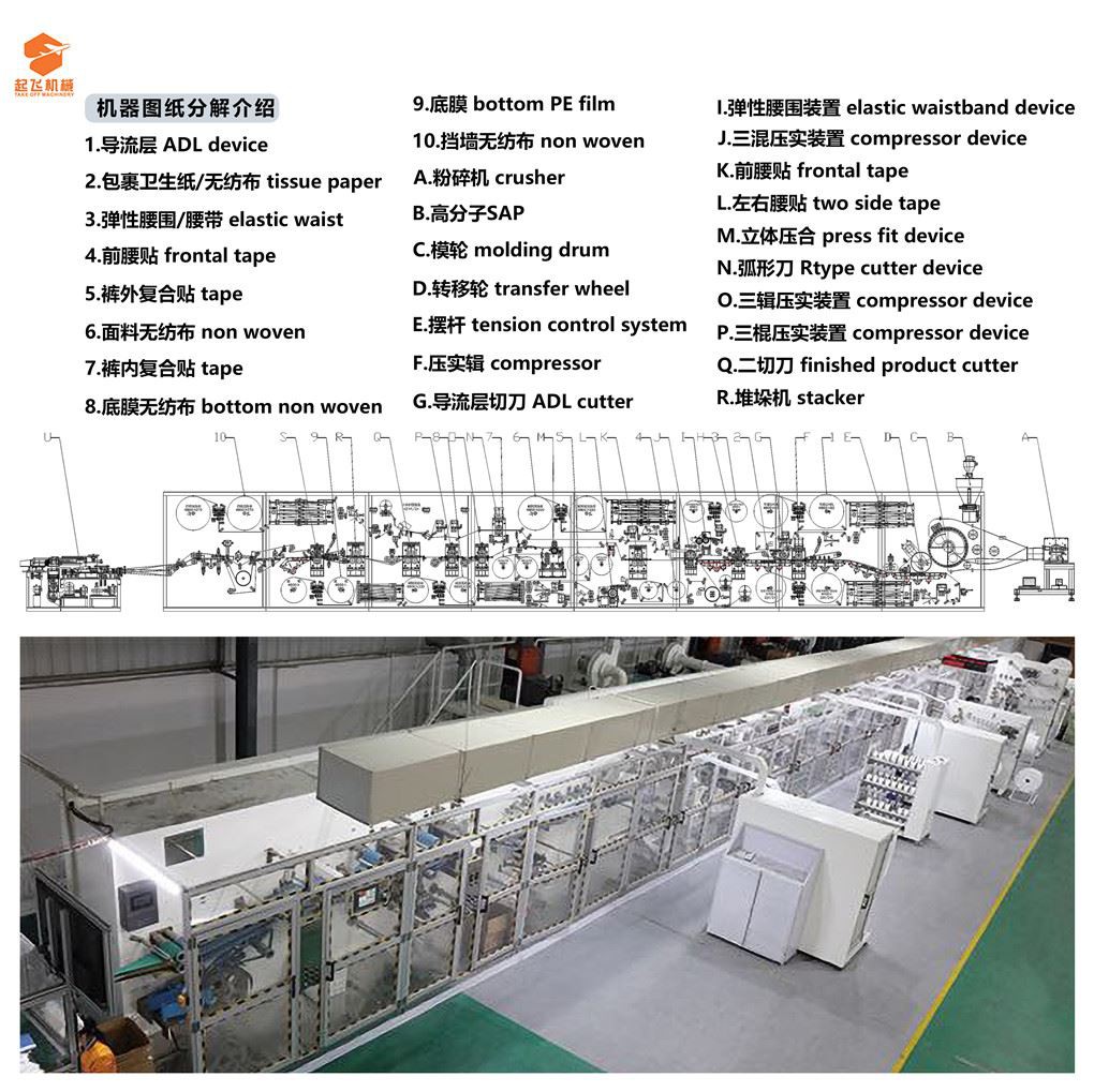 製品構造:リークプロテクト不織布、表層不織布、ADL、アップ不織布、ダウン不織布ラッピングコットン+ SAP、ボトムフィルム、フロントテープ(、両面テープ、3次元保護ゴム、レッグラバー